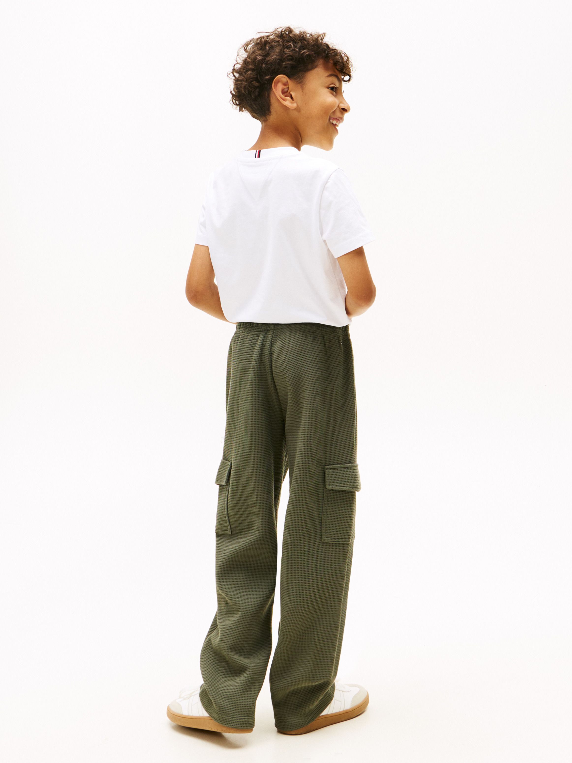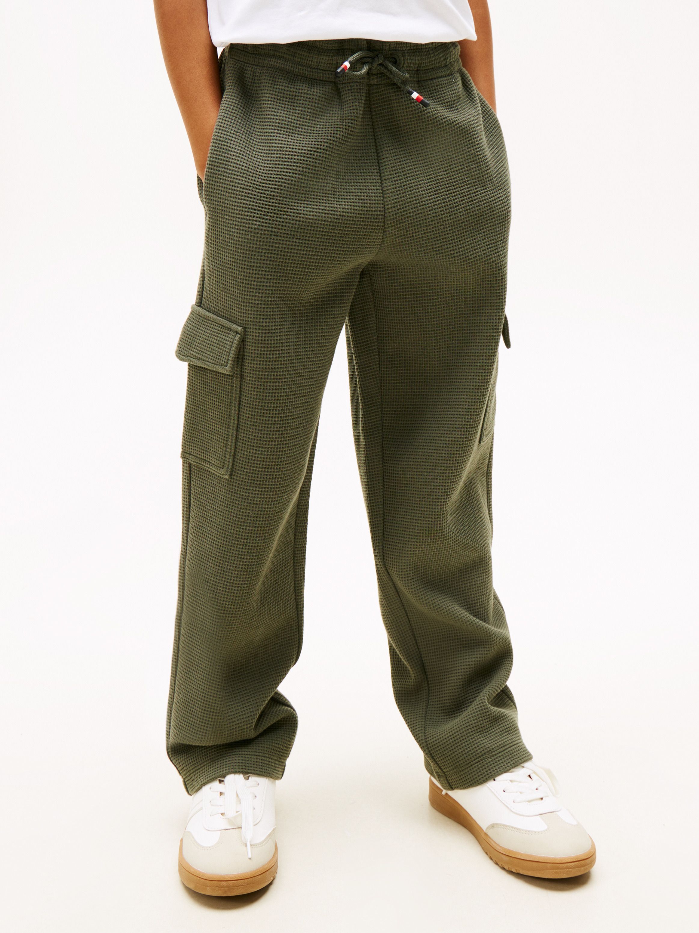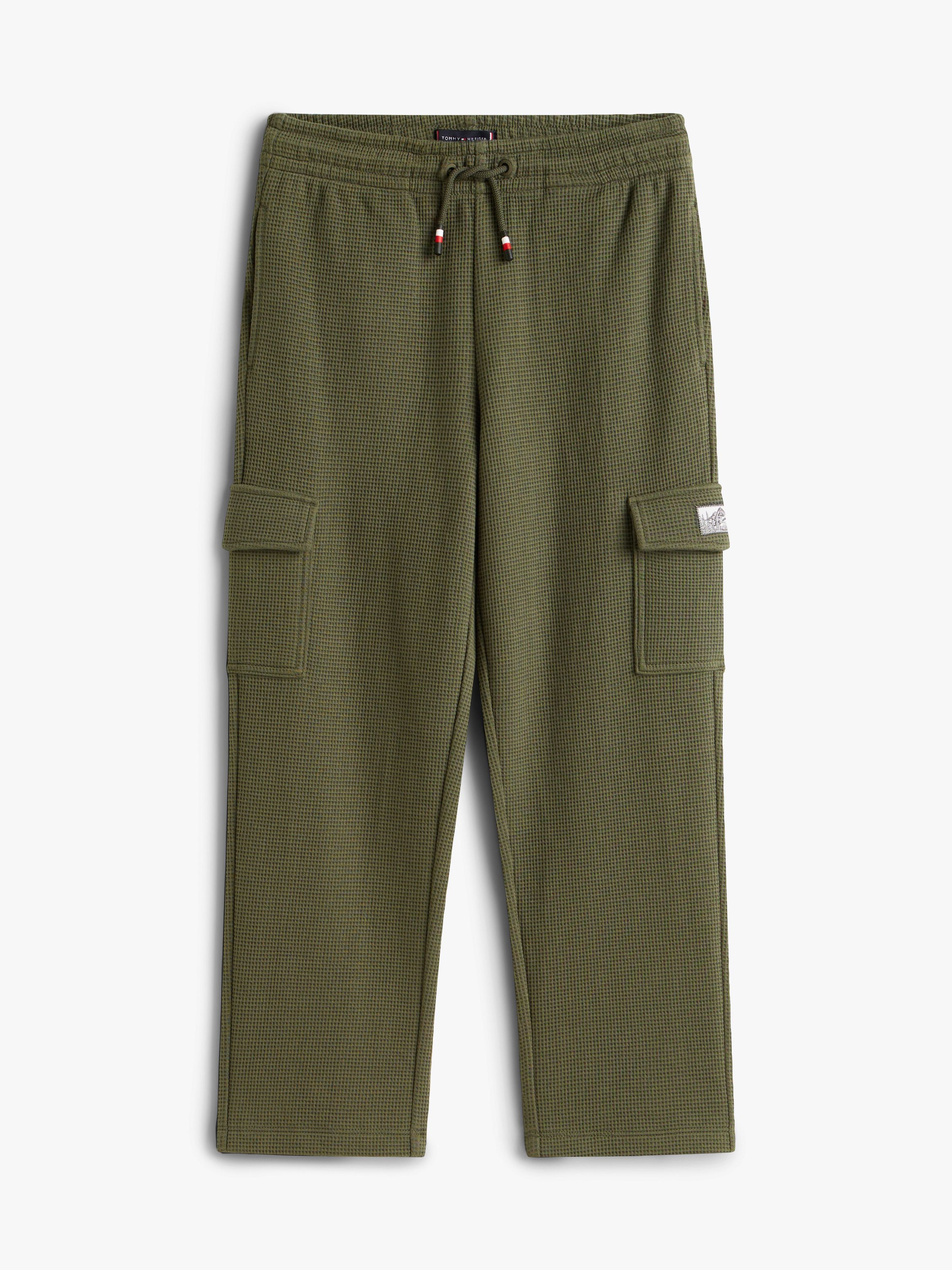 • Pure cotton • Waffle knit • Drawstring waistband • Two side cargo pockets • Branded drawstring tips • Tommy Hilfiger logo patch on pocket flap • Tommy Hilfiger branding • Tommy Hilfiger flag embroidery on back