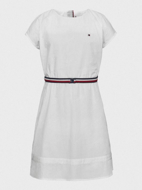 • Pure organic cotton poplin • All-over tonal logo embroidery • Round neck • Signature tape belted waist • Tommy Hilfiger repeat logo embroidery tape at hem • Tommy Hilfiger branding • Tommy Hilfiger flag embroidery on chest