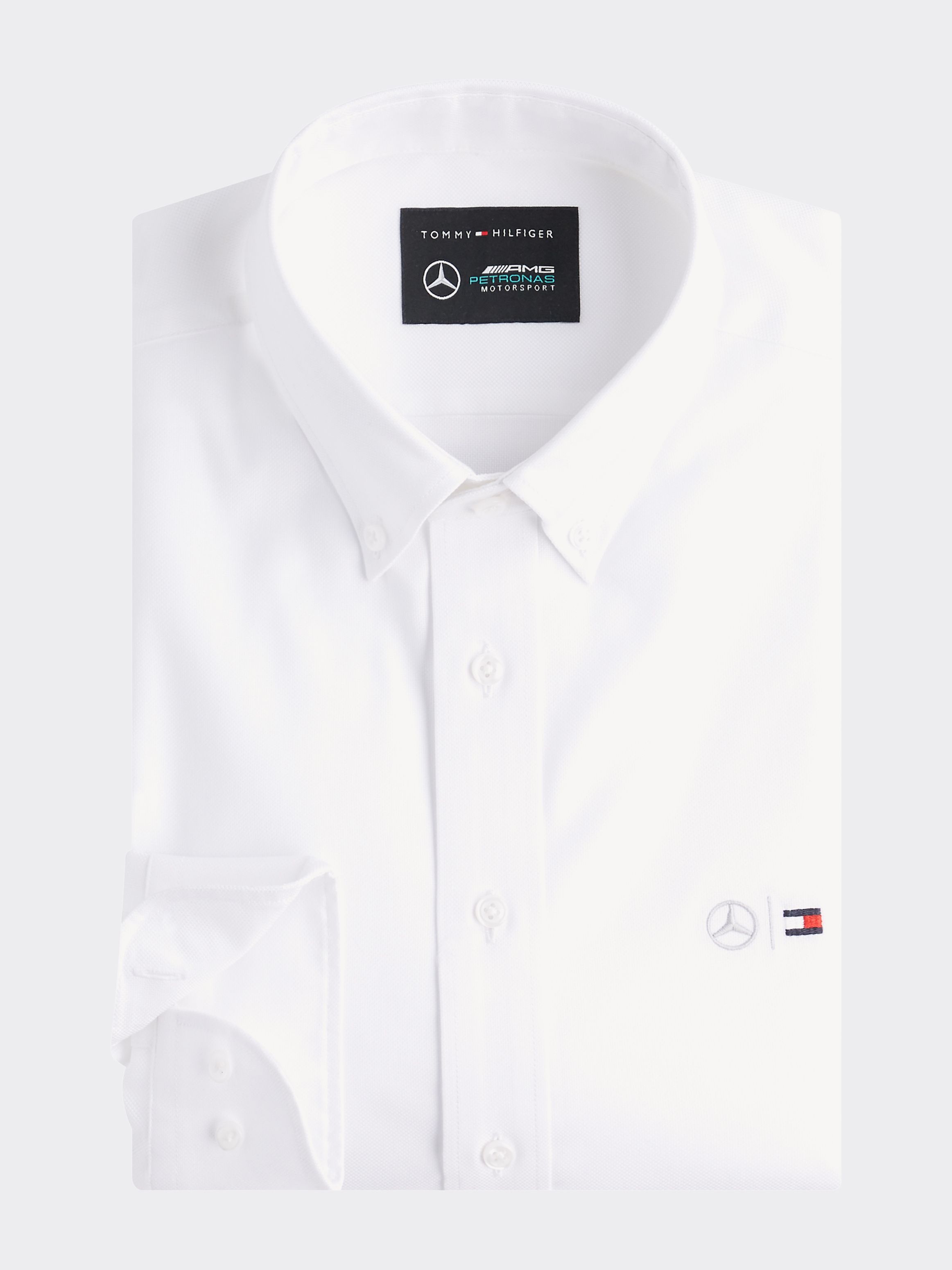 • Stretch cotton Oxford • Button-down collar • Rounded two-button cuffs • Mercedes Benz X Tommy Hilfiger branding • Tommy Hilfiger flag embroidery on chest