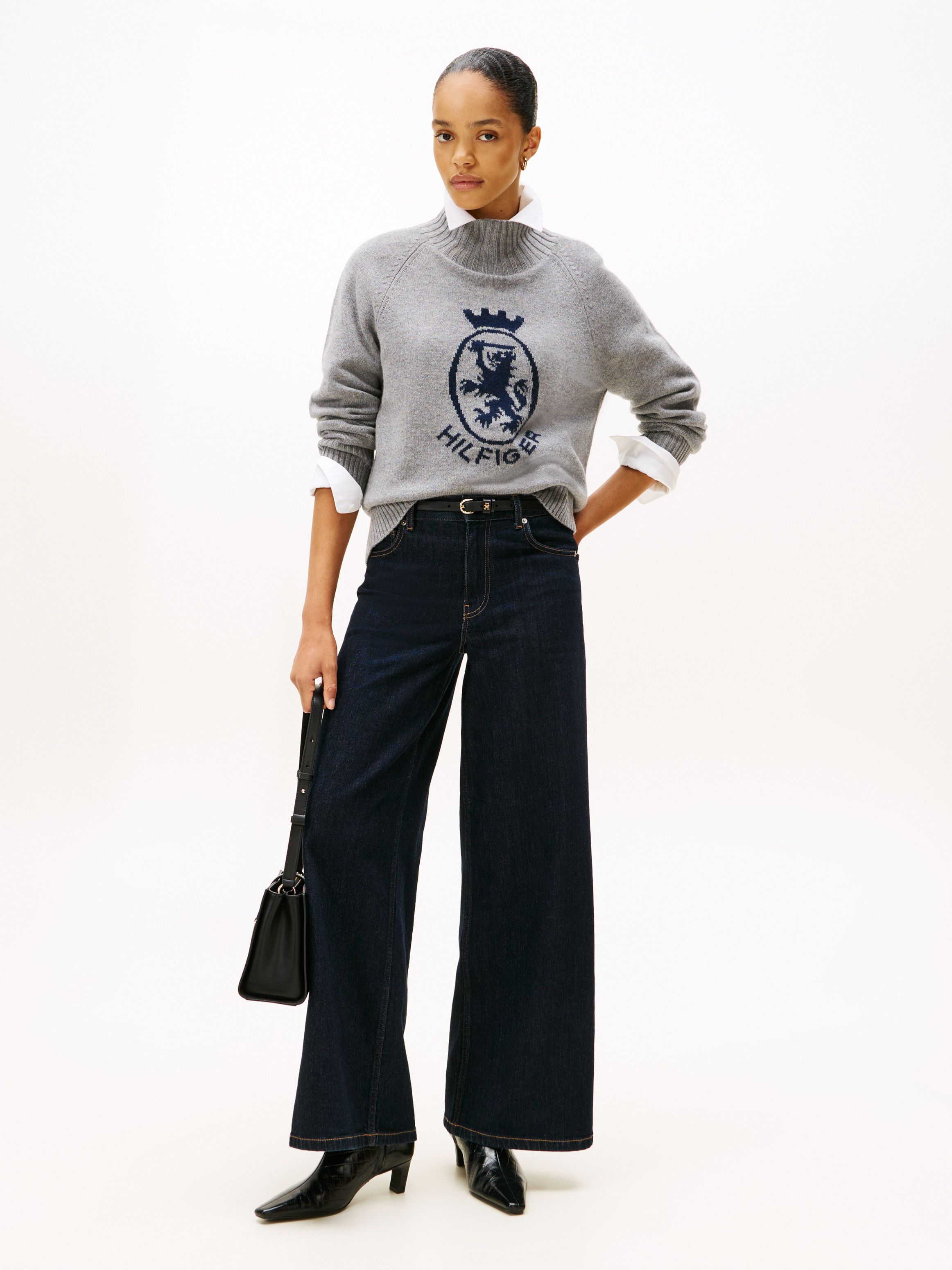 Move from day to evening seamlessly in this statement crest graphic jumper knitted from pure wool with a cosy mock neck.